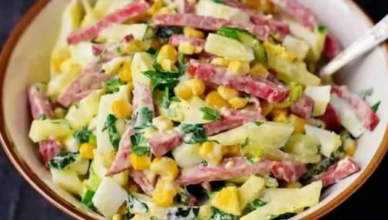 Приготую дуже смачний салат з кукурудзою та ковбасою! Салат готую із простих продуктів, які завжди є у холодильнику у кожної господині! Інгредієнти: Приготування: