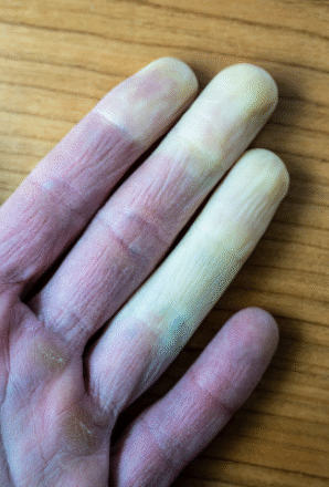 Результат : раптова та різка зміна кольору. Кінчики стають білими або навіть синіми, перш ніж повернутися до свого нормального кольору після нагрівання. Це може тривати кілька хвилин, іноді до п’ятнадцяти .