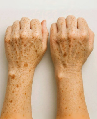 Одна з найбільш помітних змін, особливо на ділянках, що піддаються впливу сонця, таких як руки, обличчя та передпліччя, – це поява маленьких коричневих плям, зазвичай відомих як вікові плями або печінкові плями.
