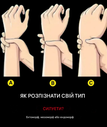 На діаграмі нижче показано, як швидко визначити, чи є ви ектоморфом, мезоморфом чи ендоморфом, на основі співвідношення пальців до зап’ястя.