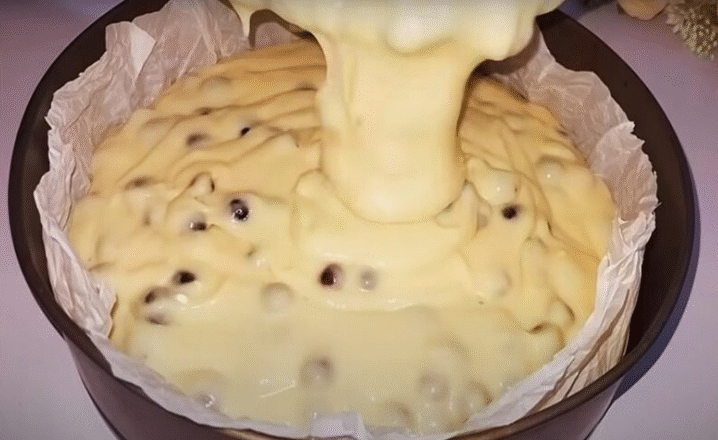 - Застеліть форму для випікання пергаментом і вилийте у неї підготовлене тісто.