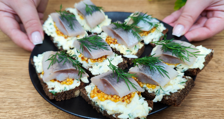 - Нанесіть на обсмажений хліб яєчну суміш, зверху викладіть шматочки оселедця.