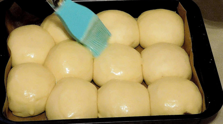 - Збийте молоко та жовток ложкою. Поставте пиріжки під плівкою на 20 хвилин|мінути|. Потім змастіть кожну булочку сумішшю яйця та молока.