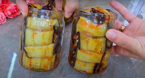 Щільно заповніть стерилізовані банки об’ємом 0,5 л рулетами з баклажанів. - Приготування маринаду :