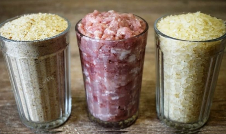 - У великій мисці змішайте фарш із обсмаженою цибулею, яйцями, молоком, сухарями, вареним рисом, сіллю та перцем. Добре вимішайте, щоб усі інгредієнти поступово змішалися.
