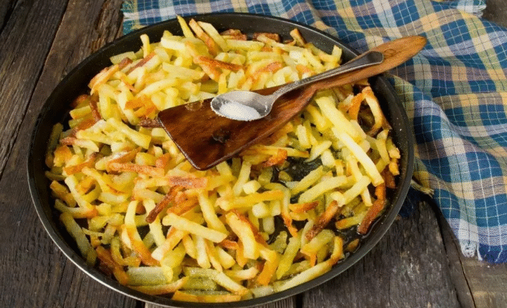 Перед смаженням нарізану картоплю слід залити прохолодною водою на 10 хвилин, а потім ретельно промити, щоб видалити надлишки крохмалю. Це допоможе запобігти прилипанню картоплі до сковороди. Після промивання картоплю потрібно трохи підсушити, щоб уникнути бризок олії під час смаження.