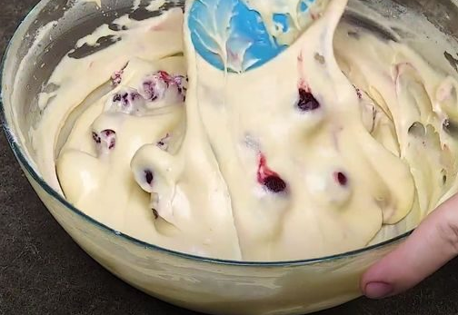 - Видаліть кісточки з вишні та змішайте її з крохмалем. Перемішайте вишню із тестом.