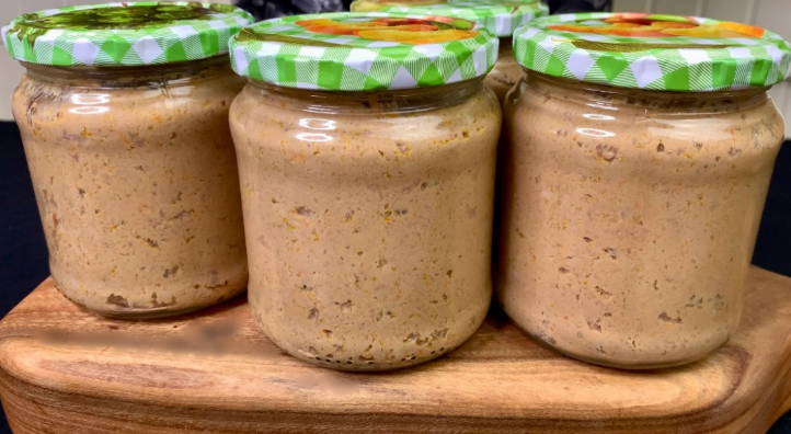 Все ретельно перемішуємо до однорідності і викладаємо паштет у чисті стерилізовані підготовлені банки, залишивши зверху 1 см.