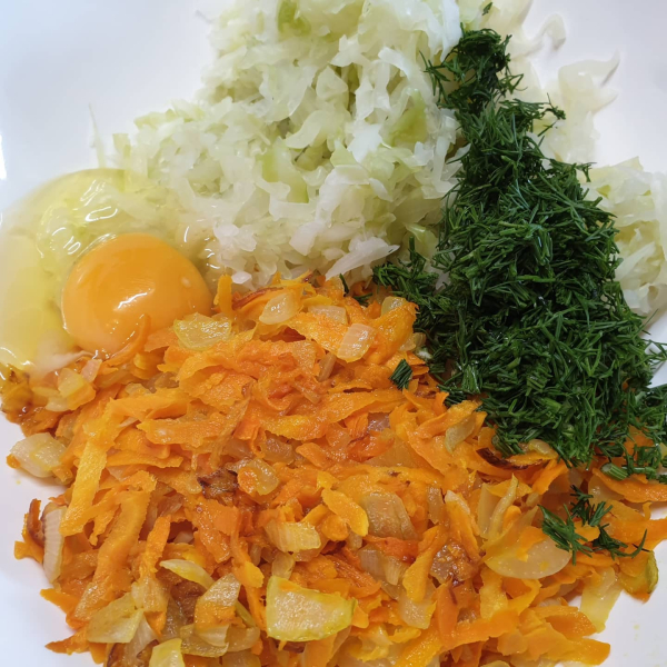 Капустку на сито, ложкою гарненько віджимаємо зайву рідину, остуджуємо і додаємо зі сковорідки також охолоджену моркву і цибулю , за бажанням зелені коханої, посолити, поперчити, прованських трав, 1 яйце, ~3 ложки борошна.