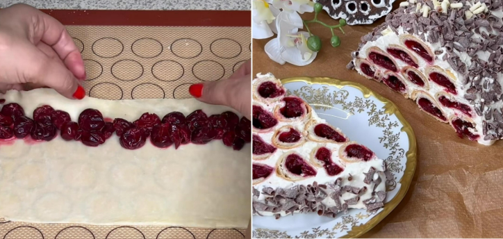 5. На край по довгій стороні щільно укладаємо вишню, закручуємо в рулет.