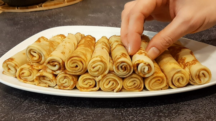 Навіть перший млинець з такого тесту вийде грудкою, легко перевернеться на сковороді і красиво згорнеться в рулет. Смажуються млинці швидше, ніж звичайно.