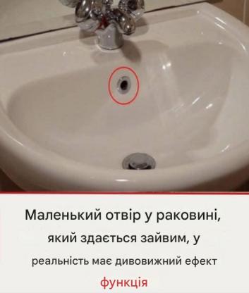 Фактично, цей невеликий, непомітний отвір, розташований приблизно на третині висоти умивальника, є геніальним рішенням, яке демонструє продуманий та далекоглядний задум творця умивальника, який передбачив можливі сценарії.