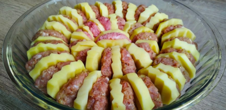 4. Викладіть картопля і фрикадельки на деко, змащене маслом, відповідно до моделі, що додається.