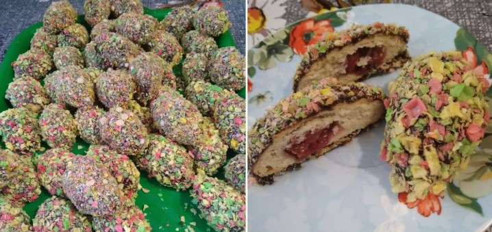 Замішуємо тісто, щоб не було тверде. Відщипуємо шматочок тіста, в середину даю вишеньку і виготовляємо їжачки. Вони завжди в мене різної величини, цього разу майже куряче яйце.
