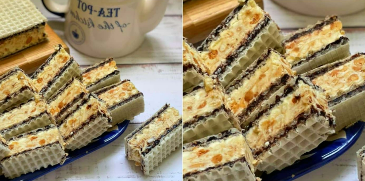 До крему, що залишився додати подрібнене печиво «Марія» і горішки. Все добре вимішати та викласти на одну пару вафель. Зверху накрити другою парою і добре притиснути.