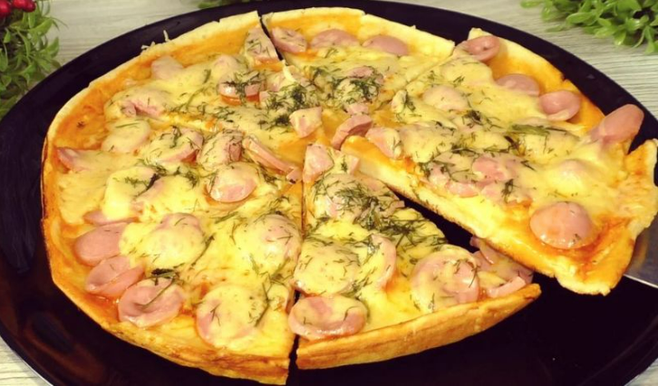 Зверху кладемо будь-яку начинку. У мене найпростіший варіант, сосиски, якщо є помідори, болгарський перець, також додавайте. Щедро посипати сиром.