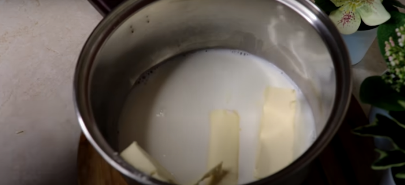 Насамперед у сотейник вливаємо 200 мл. молока та додаємо 100 г м’якого вершкового масла. Нагріваємо інгредієнти на плиті, постійно помішуючи.
