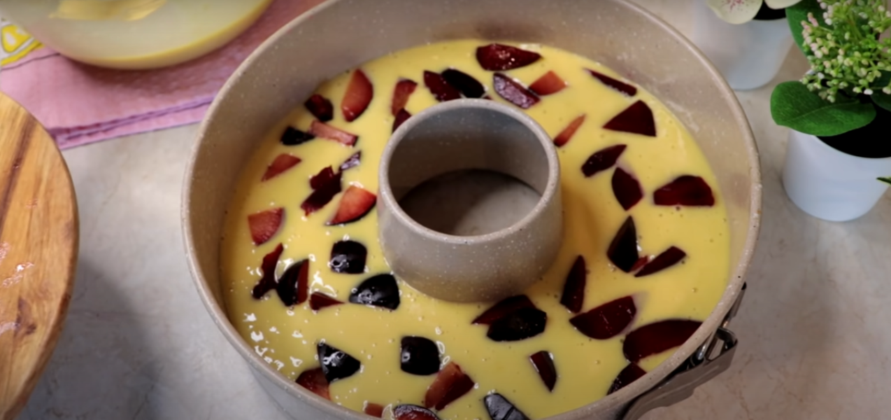 Круглу форму діаметром 24 см. змащуємо маслом і вливаємо в неї ½ частина тесту, що вийшов. До тесту додаємо сливи, рівномірно розподіляючи їх формою. Далі заливаємо сливи тестом і зверху викладаємо ще трохи слив.