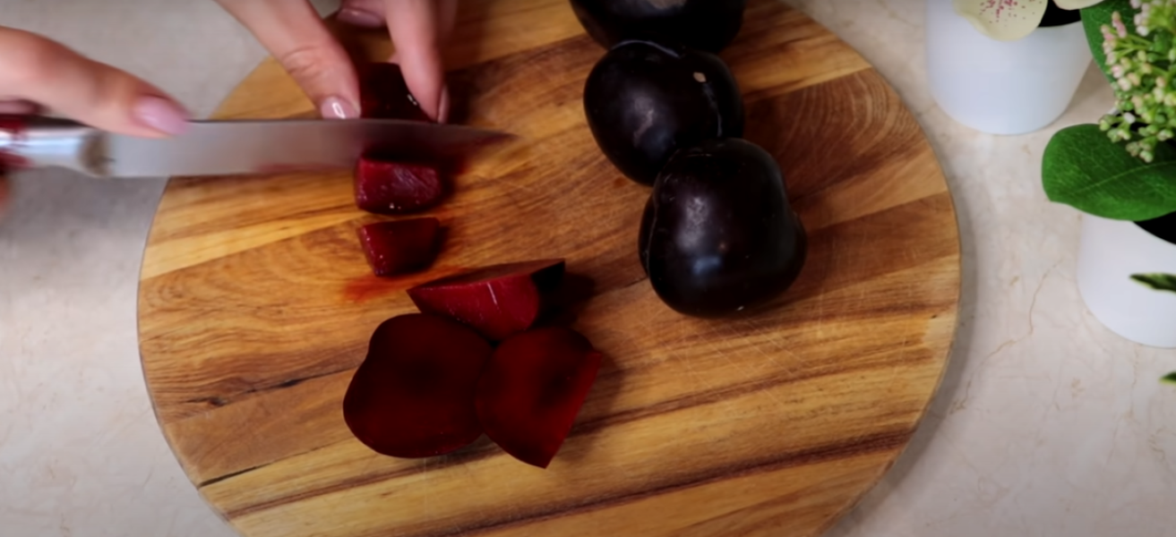 Беремо 4 сливи і нарізаємо її невеликі шматочки, попередньо позбавившись кісточок. Можна брати заморожені ягоди, фрукти чи сухофрукти, а взимку та яблука.