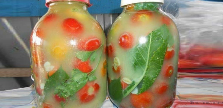 На дно банки скласти листя та спеції, на них помідори, зверху насипати сіль, цукор та гірчицю, акуратно залити холодною водою.