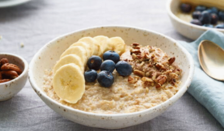 Якщо ви оберете вівсянку, її приготування надзвичайно просте та потребує лише кількох інгредієнтів. Просто зваріть 40 г вівсяних пластівців (близько 5 столових ложок) у 250 мл молока або рослинного молока в мікрохвильовій печі або каструлі. Зачекайте кілька хвилин перед вживанням і додайте горіхову пасту , свіжі фрукти, такі як чорниця, ожина, полуниця або банани, залежно від сезону. Ви також можете додати сухофрукти для посилення смаку.