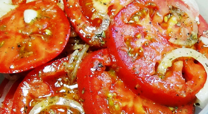 - Полийте овочі приготованим маринадом. Помідори почнуть виділяти сік і маринуватися у власному соку та заправці.