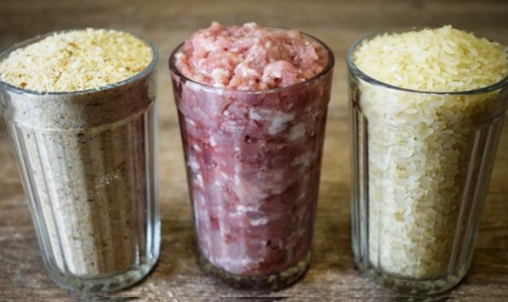 - У великій мисці змішайте фарш із обсмаженою цибулею, яйцями, молоком, сухарями, вареним рисом, сіллю та перцем. Добре вимішайте, щоб усі інгредієнти поступово змішалися.