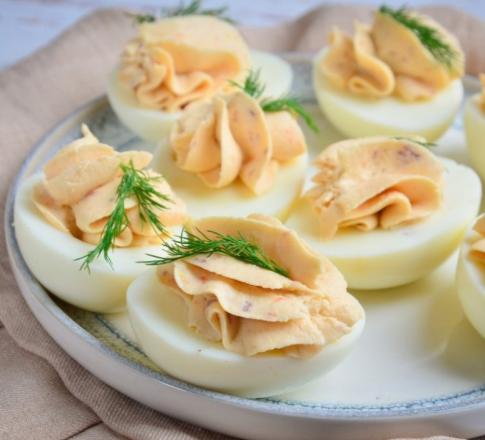 - Перекладіть пасту в кулінарний мішок і наповніть половинки яєць цією смачною начинкою.