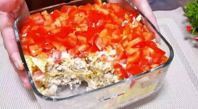 У мене останній шар салату порізані кубиками помідори.