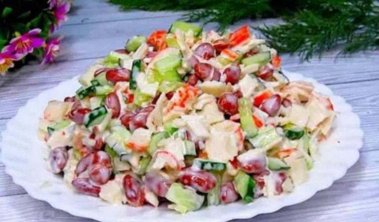 Огірок, крабові палички нарізаю кубиками. Всипаю квасолю, часник натираю на терці.