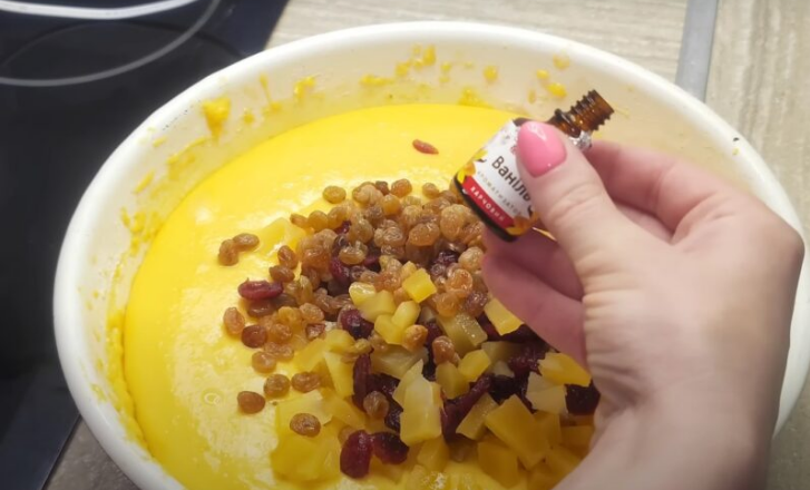 - Зливаємо зайву рідину з цукатів і додаємо в тісто. Збиваємо ще 10 хвилин.