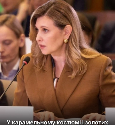Цього дня Зеленська постала у гарному образі. На ній був діловий костюм карамельного кольору, який складався з двобортного жакета і прямих штанів зі стрілками, і різнокольорова блузка.